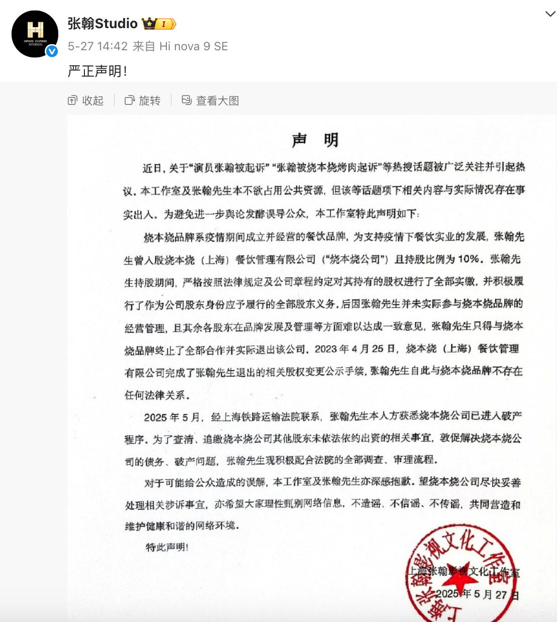 此前,张翰被曾主理的烧本烧烤肉品牌起诉引发热议,对此张翰方回应称对持有的股权进行了全部实缴,后因与其余各股东在品牌发展及管理等方面难以达成一致意见,只得终止了全部合作并实际退出该公司,并将积极配合法院的全部调查、审理流程。