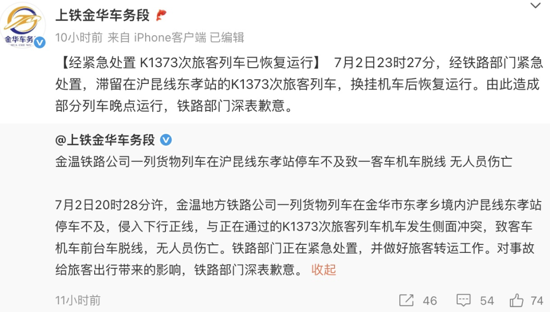 7月2日晚,上海铁路局金华车务段发布通报: