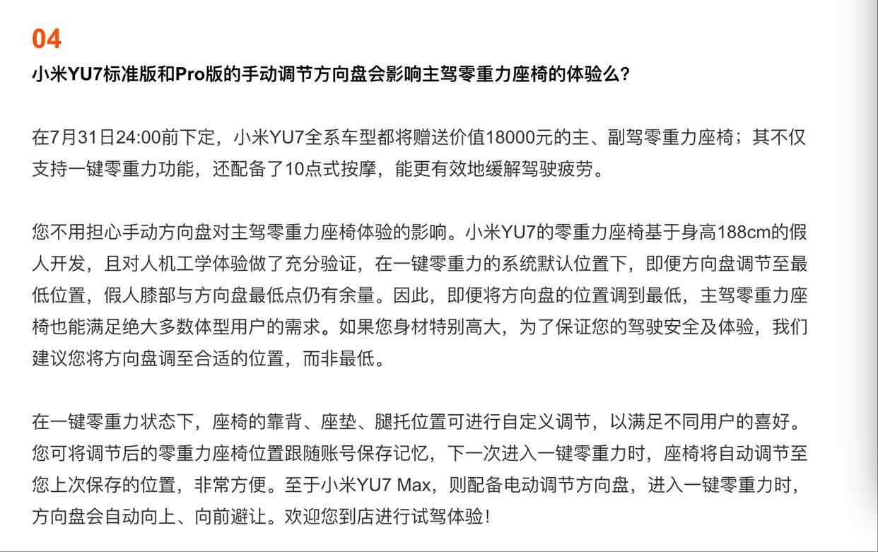 针对小米 YU7 标准版和 Pro 版的手动调节方向盘是否会影响主驾零重力座椅体验的问题,雷军并未在直播中提到,但是小米汽车官方通过微博做了回应。