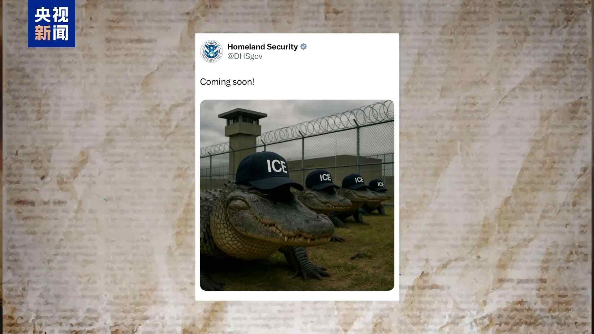 美国国土安全部的官方社交账号甚至发了一张图片,一群鳄鱼头戴着“移民与海关执法局”的棒球帽,在高墙电网外面虎视眈眈。下面有网友留言说: