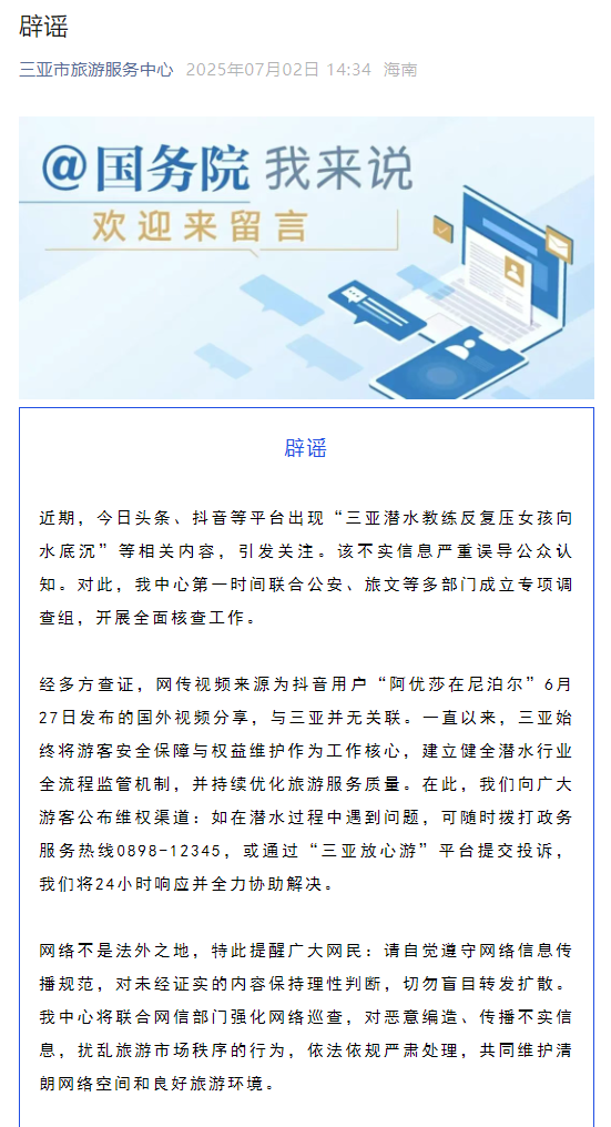 7月2日,三亚市旅游服务中心发布一则辟谣公告。公告称,近期,今日头条、抖音等平台出现“三亚潜水教练反复压女孩向水底沉”等相关内容,引发关注。该不实信息严重误导公众认知。对此,三亚市旅游服务中心第一时间联合公安、旅文等多部门成立专项调查组,开展全面核查工作。