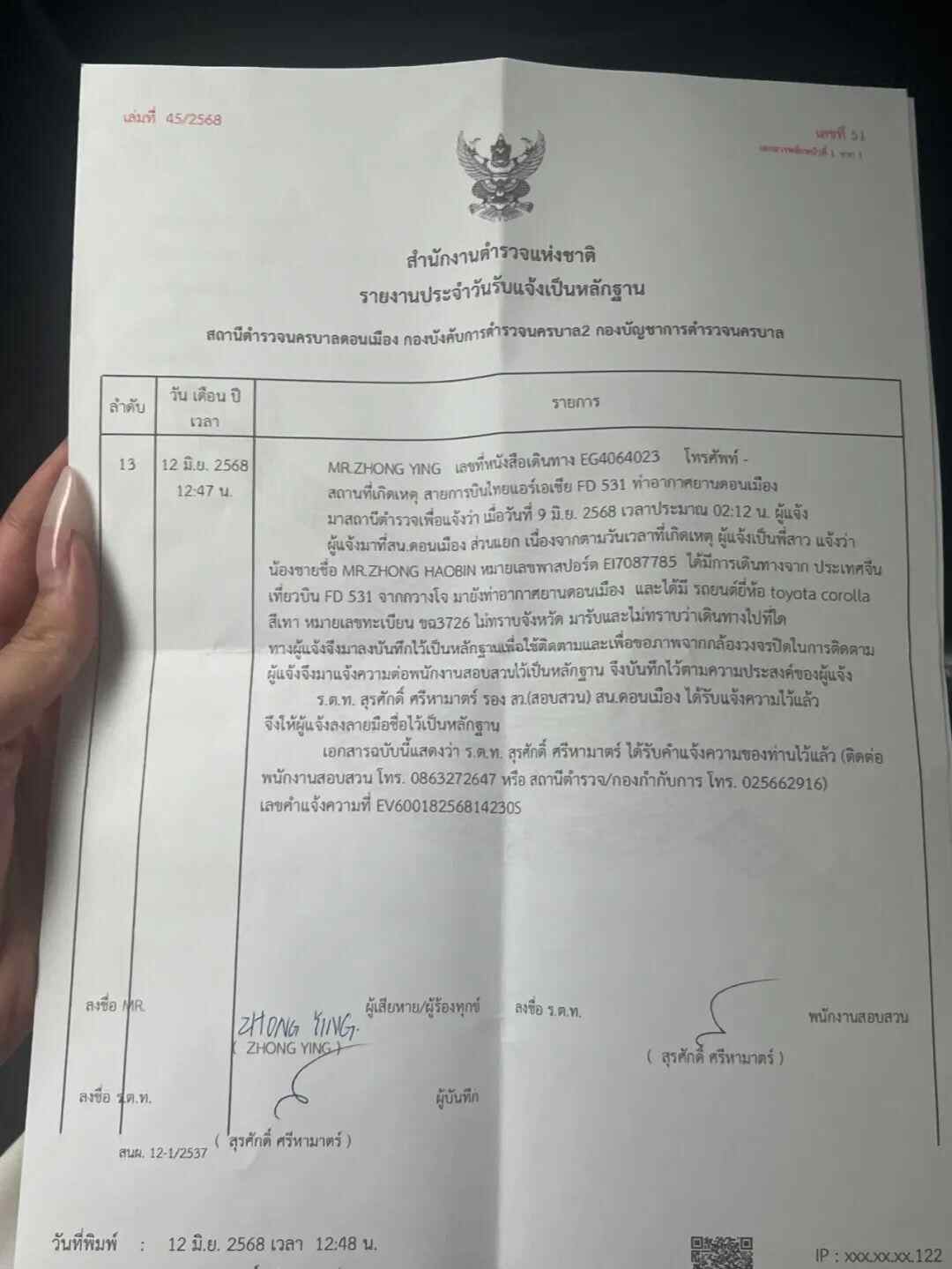 我弟弟一直从事的模特工作已经四五年的时间,这次因接到杂志封面拍摄邀请,在2025年6月8日晚上12点33分在广州白云机场乘坐飞机FD531到泰国,2025年6月9日凌晨2点12分到达泰国廊曼机场,凌晨3点15分在泰国廊曼机场6号门坐上了一辆车牌号:ขฉ3726 อุดรธานี的Toyota私家车,被带到泰国达府后失联。原本预订的酒店(B Your Home Hotel Donmueang Airport Bangkok)也并未入住。