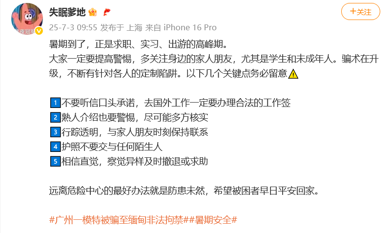 暑期到了,正是求职、实习、出游的高峰期。大家一定要提高警惕,多关注身边的家人朋友,尤其是学生和未成年人。骗术在升级,不断有针对各人的定制陷阱。以下几个关键点务必留意: