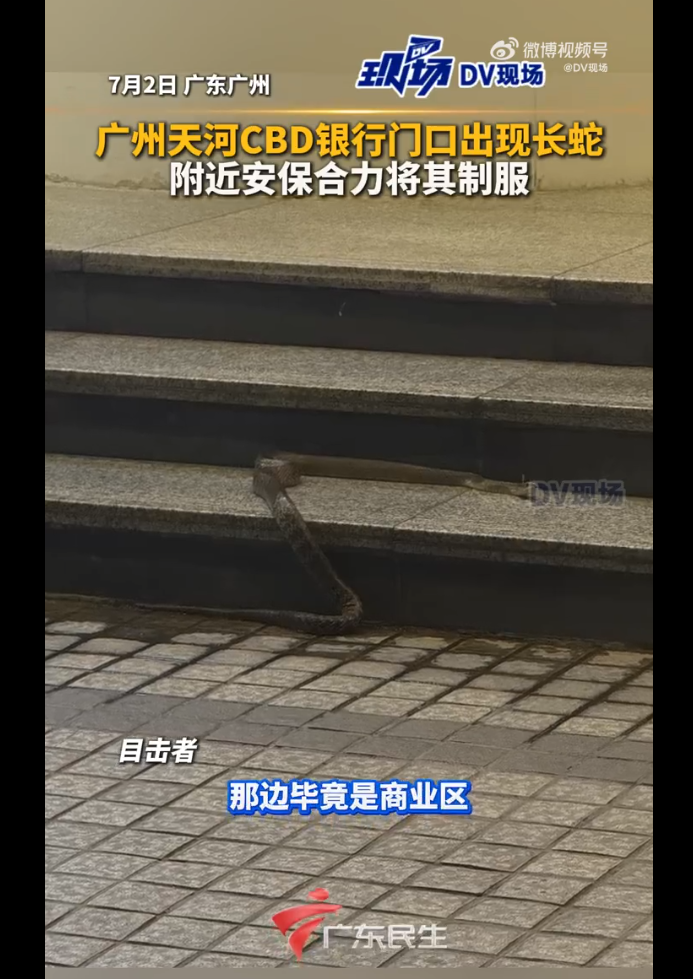 7月2日,广东广州。有网友报料称,天河CBD一银行门口出现一条长蛇。目击者告诉记者,当时这条蛇在银行门口的台阶上,因为身处商业区,也比较危险。