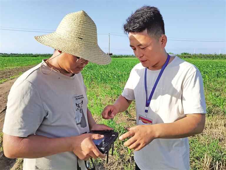 新农人齐昆(右)指导农户使用无人机(资料照片)。 受访者供图