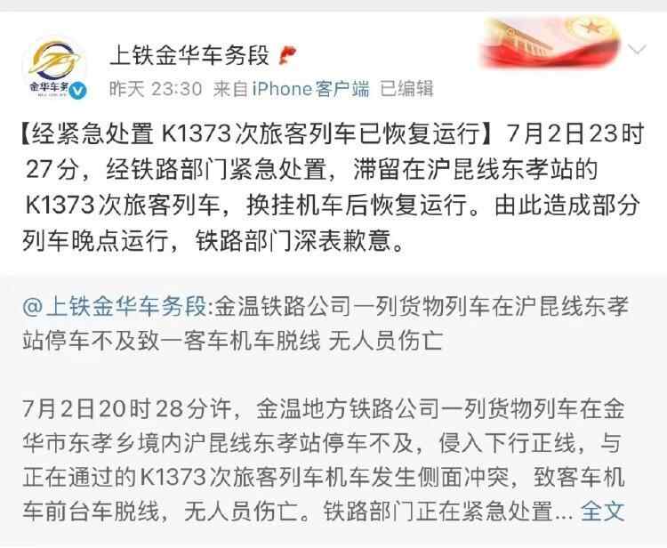 7月2日23时27分,据上海铁路局金华车务段再发通报,经铁路部门紧急处置,滞留在沪昆线东孝站的K1373次旅客列车,换挂机车后恢复运行。由此造成部分列车晚点运行,铁路部门深表歉意。