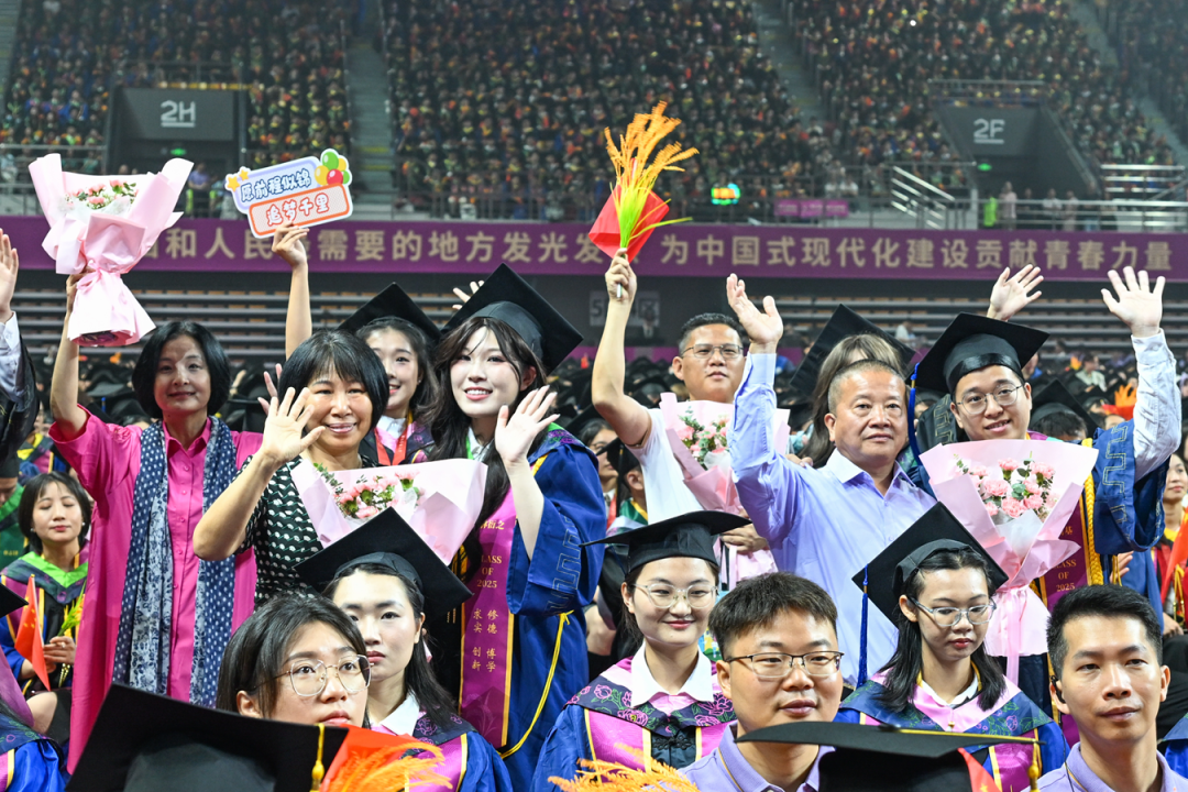 华工毕业生代表则向父母和教职工献花;华农“百优毕业生”代表向父母献上鲜花与拥抱,现场紫荆花瓣飘落,亲情与毕业情交织成温馨画面。