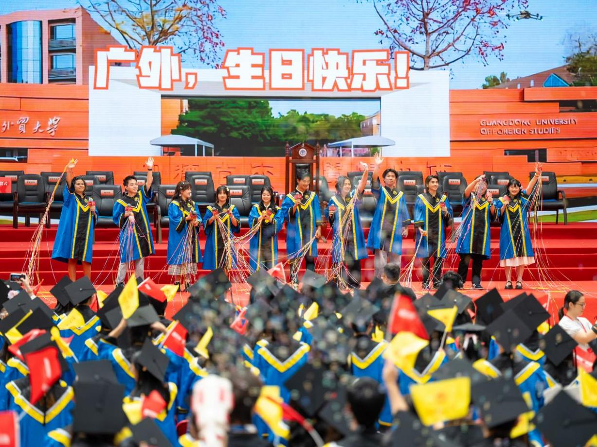 伴随着别开生面的毕业快闪,全体毕业生合唱多语种生日快乐歌,共同祝福母校60周年生日快乐,瞬间点燃现场氛围,这是广东外语外贸大学2025届毕业典礼开始前的精彩瞬间,气氛温馨而热烈。8299名毕业生在广外六秩芳华的悠扬弦歌中扬帆启航。此外,他们用30多种语言书写的“毕业快乐”打卡墙,搭配内含雏菊、太阳花等6种花种的“种子纸”邀请函,让感恩与希望随种子一同播撒。