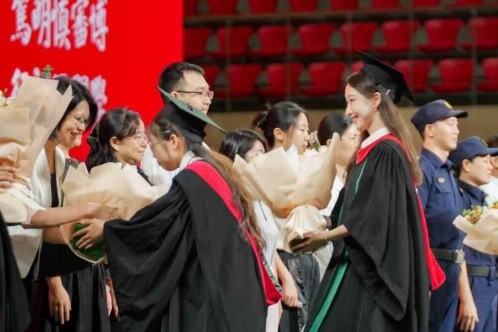 中大特别邀请18位普通工作者代表登台,辅导员、教辅、实验员、校医、宿管员、保卫员、维修师傅、保洁员、厨师等站上典礼台,接受毕业生献花。“他们是校园生活的隐形守护者,今天终于走到聚光灯下。”一位毕业生在献花时说道。