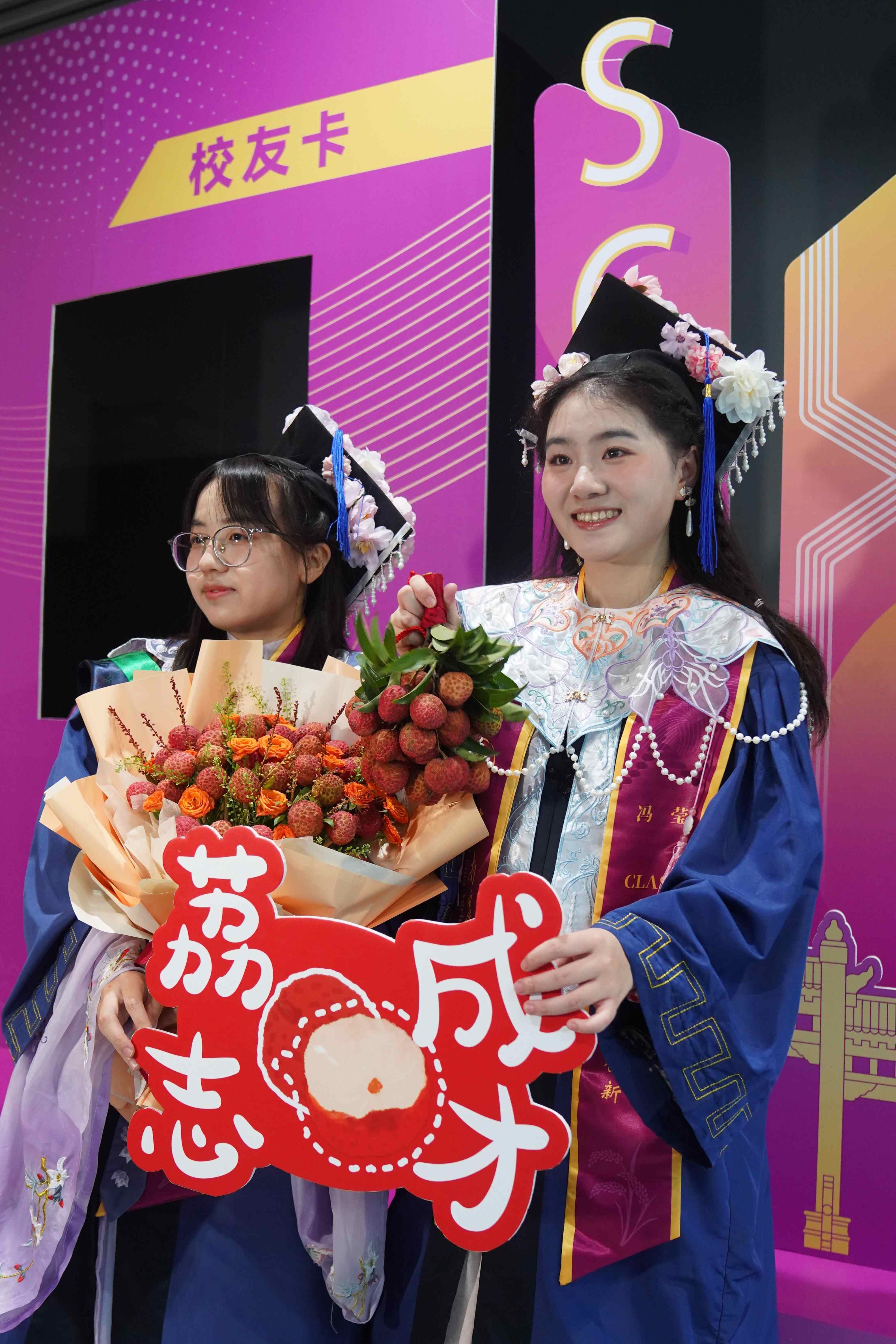 今年是荔枝的大丰收年,荔枝也在各高校迎来自己的“高光时刻”——华南农业大学园艺学院毕业生手捧教学实践基地采摘的“荔枝捧花”,拎着“荔枝包”上台合影,自产水果变身最接地气的毕业信物。