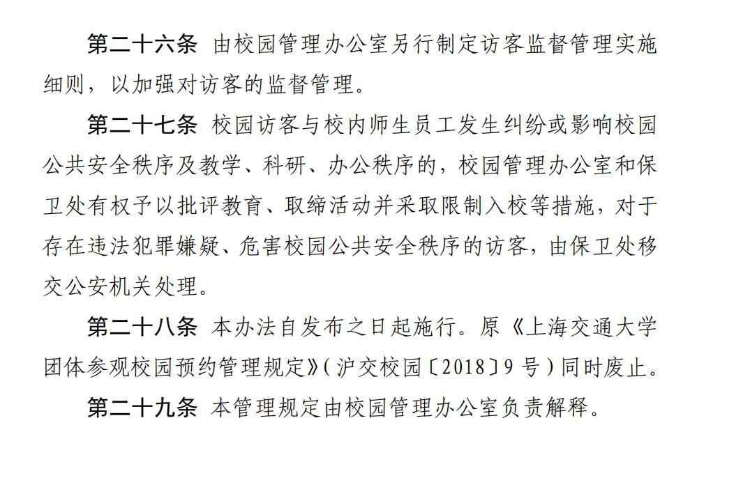 上海交通大学参观交大板块不仅提供了预约通道,还附上了访客须知、校园文明行为暂行管理规定和校园访客参观管理暂行办法。其中,访客须知里提到,访客须遵守学校相关管理规定文明参观,学校有权对不文明行为采取相关措施,请自觉维护校园秩序。