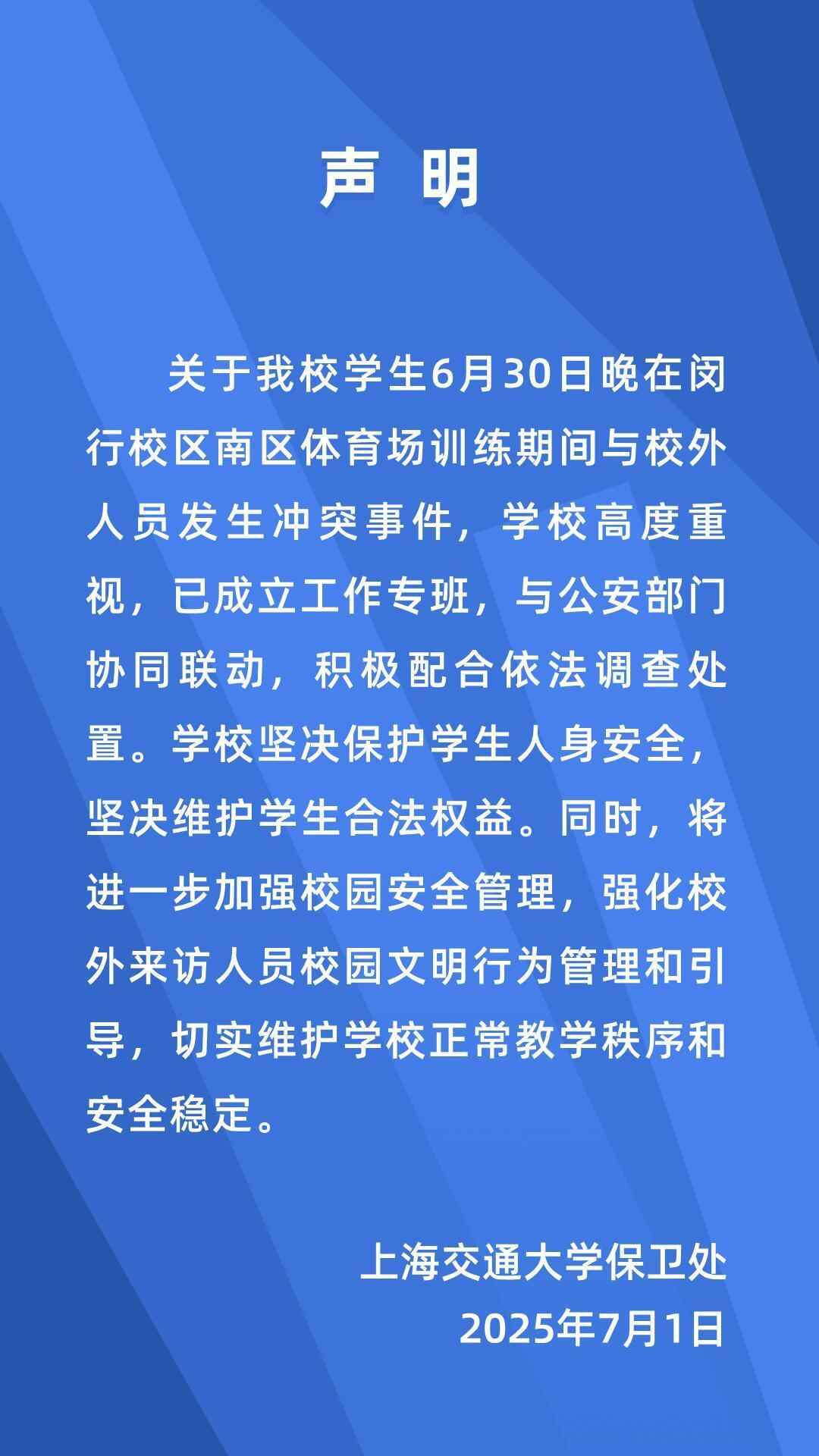 7月2日,上海交通大学保卫处发布声明称,关于此事已成立工作专班,与公安部门协同联动,积极配合依法调查处置。学校坚决保护学生人身安全,坚决维护学生合法权益。同时,将进一步加强校园安全管理,强化校外来访人员校园文明行为管理和引导,切实维护学校正常教学秩序和安全稳定。