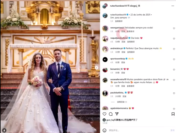 若塔6月22日刚刚与妻子举行婚礼,距今日逝世仅完婚11天,社交媒体最后一条动态是婚礼纪念。