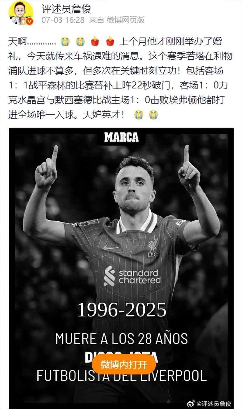 刚刚,著名评论员詹俊微博发文悼念若塔:上个月他才刚刚举办了婚礼,今天就传来车祸遇难的消息。这个赛季若塔在利物浦队进球不算多,但多次在关键时刻立功!包括客场1:1战平森林的比赛替补上阵22秒破门,客场1:0力克水晶宫与默西塞德比战主场1:0击败埃弗顿他都打进全场唯一入球。天妒英才。