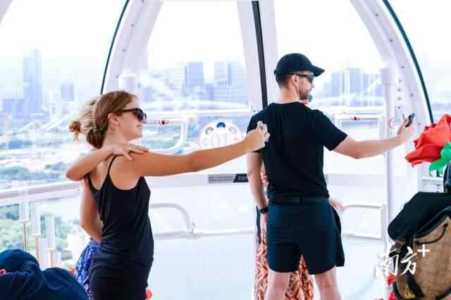 游客在深圳欢乐港湾景区乘坐“湾区之光”摩天轮,俯瞰粤港澳大湾区绝美风光。