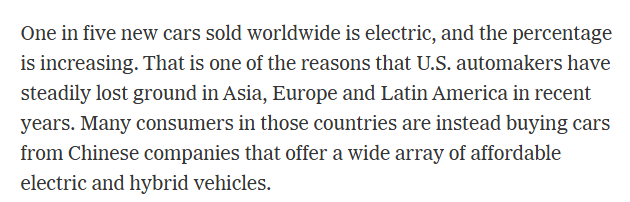 文章说,全球售出的每5辆新车中就有1辆是电动汽车,而且这一比例还在增加。这是美国汽车制造商近年来在亚洲、欧洲和拉丁美洲逐渐失去地位的原因之一。这些国家或地区的许多消费者都在从提供各种价格实惠的电动和混合动力汽车的中国公司处购买汽车。