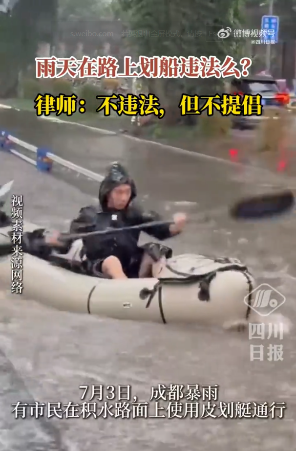成都暴雨致部分道路积水,还有市民在路上划皮艇。