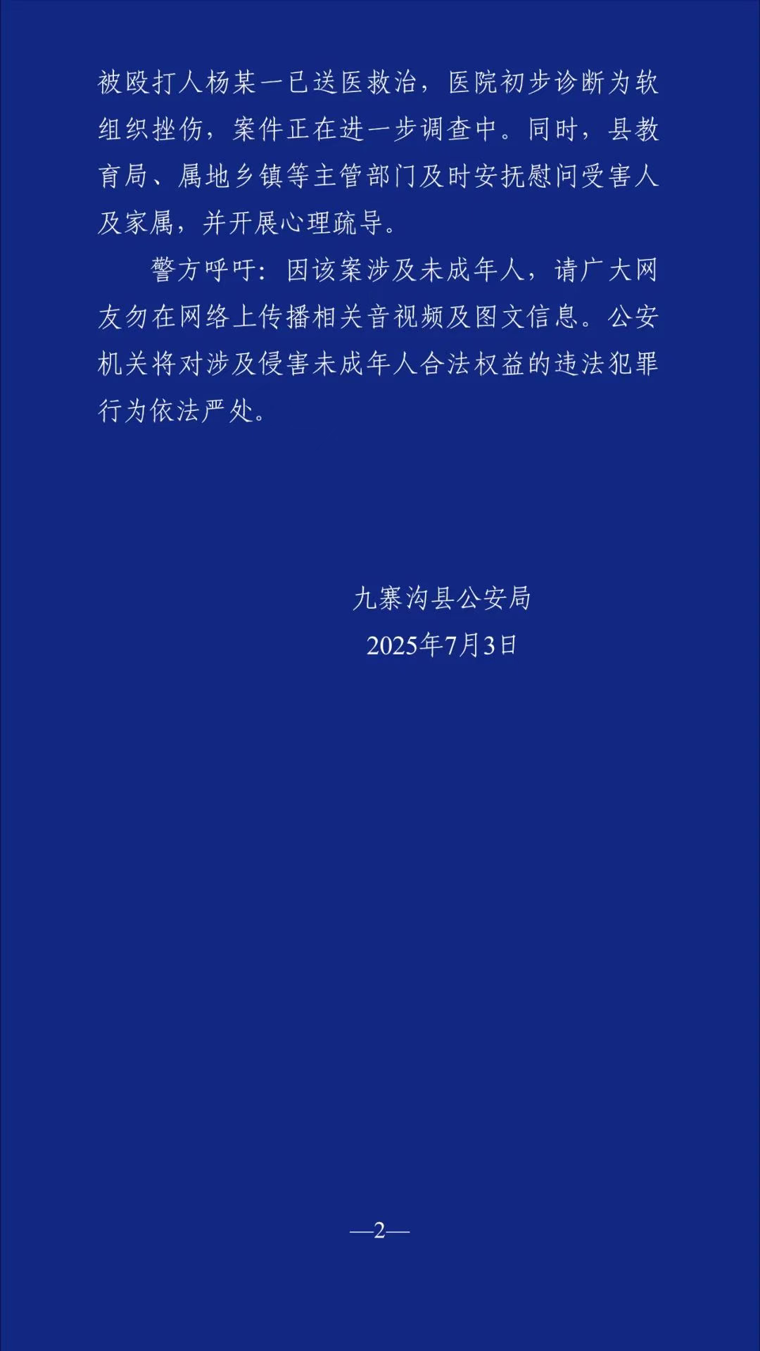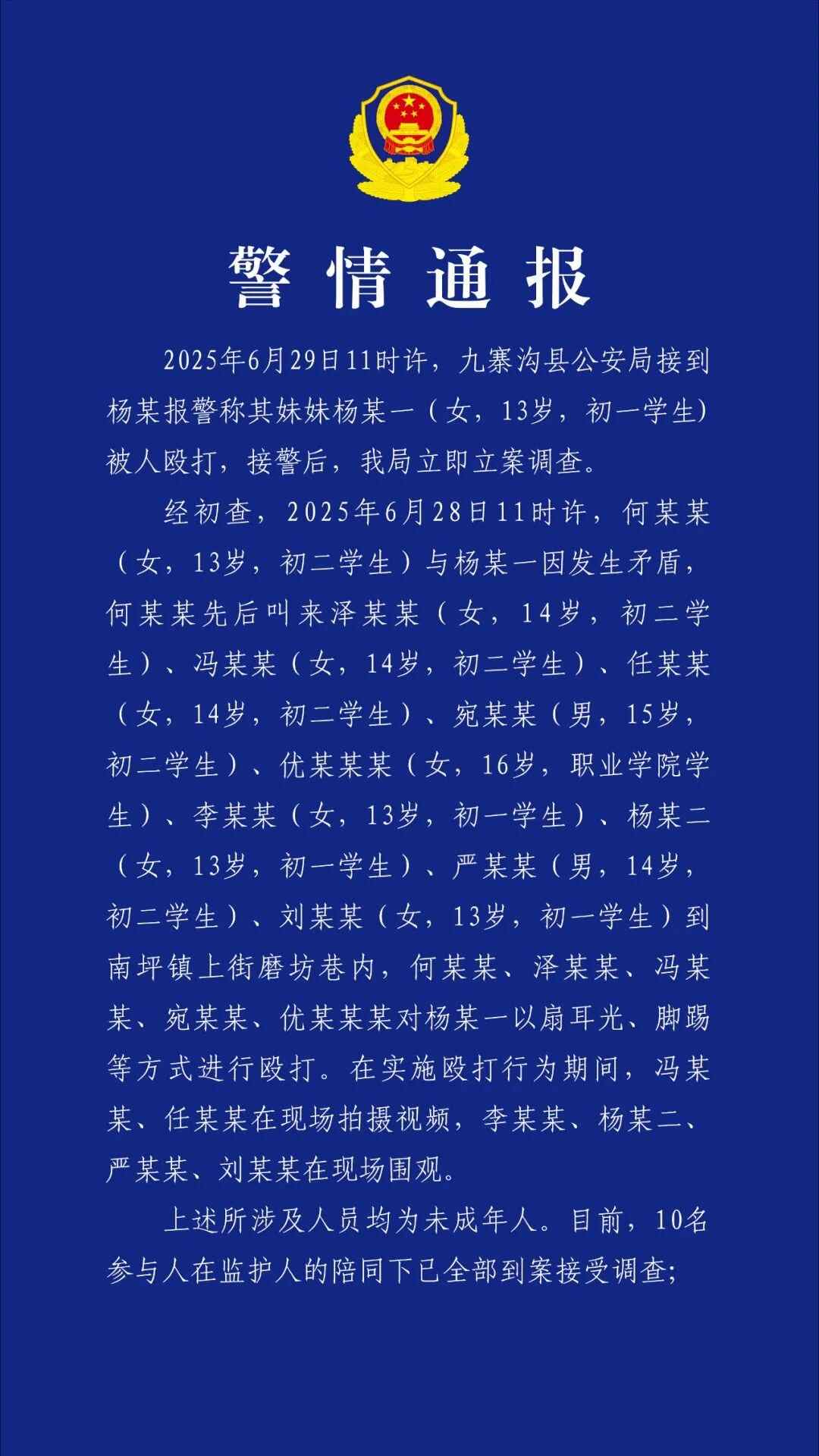 2025年6月29日11时许,九寨沟县公安局接到杨某报警称其妹妹杨某一(女,13岁,初一学生)被人殴打,接警后,我局立即立案调查。
