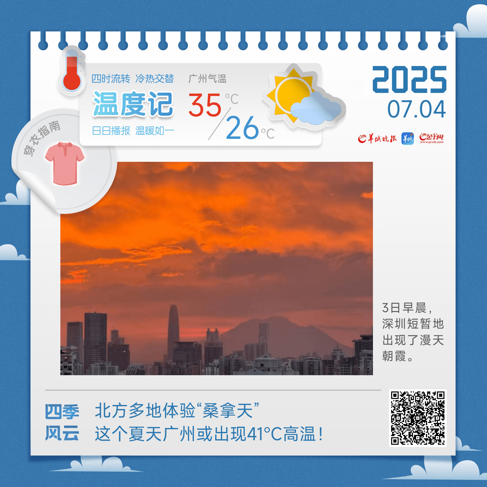 广州市气象部门预计,今年第三季度(7月至9月),广州平均气温28.4~29.3°C,较近30年(1995-2024年,下同)同期(28.3°C)偏高0.1~1.0°C。期间极端最高气温较近30年同期偏高,各区在37.0~41.0°C之间。换而言之,广州平均气温将比常年偏高,或将出现41℃高温。