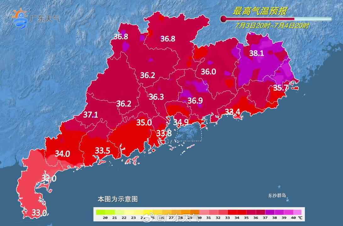 4日,粤西市县多云,有分散(雷)阵雨,其余市县多云,局部有(雷)阵雨。最高气温:粤东沿海市县、粤西和珠江三角洲南部市县31~34℃,其余市县35~37℃。