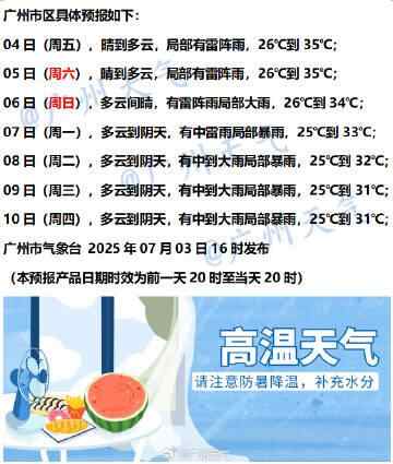 广州方面,今明两天高温炎热天气持续,最高气温35℃上下,但体感温度可达40℃,户外活动要注意防暑防晒,多多补水。下周天气转不稳定,降雨再次趋于明显。