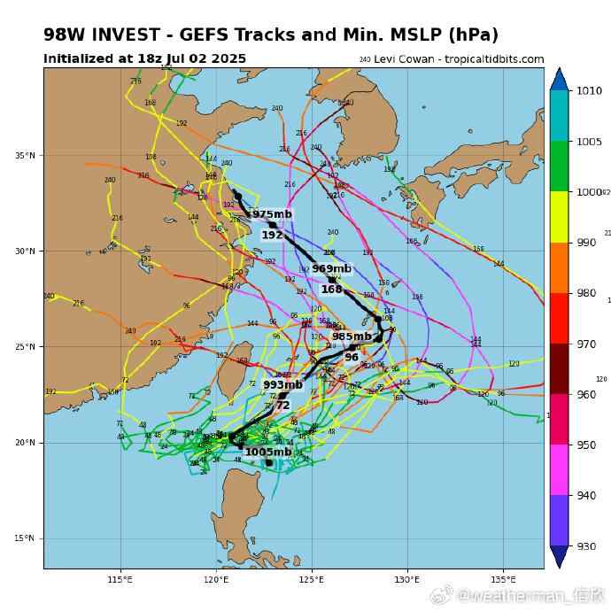 需要重点关注的是目前在菲律宾附近的低压扰动(98W),这个系统因为引导气流不明确,后期路径依然分歧巨大,可能会登陆我国、日本、韩国其中之一。