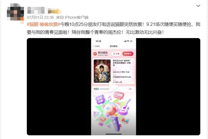 7月1日晚,有网友在社交平台反映猫眼平台上的周杰伦济南演唱会突然偷偷放票。有网友晒图表示已被猫眼强制退票。