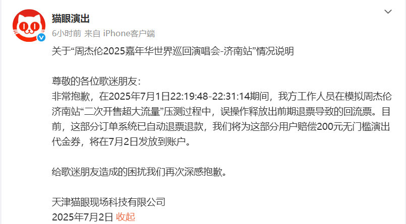 7月2日凌晨,猫眼演出发布关于“周杰伦2025嘉年华世界巡回演唱会-济南站”的情况说明:非常抱歉,在2025年7月1日22:19:48-22:31:14期间,猫眼工作人员在模拟周杰伦济南站“二次开售超大流量”压测过程中,误操作释放出前期退票导致的回流票。目前,这部分订单系统已自动退票退款,猫眼将为这部分用户赔偿200元无门槛演出代金券,将在7月2日发放到账户。给歌迷朋友造成的困扰我们再次深感抱歉。