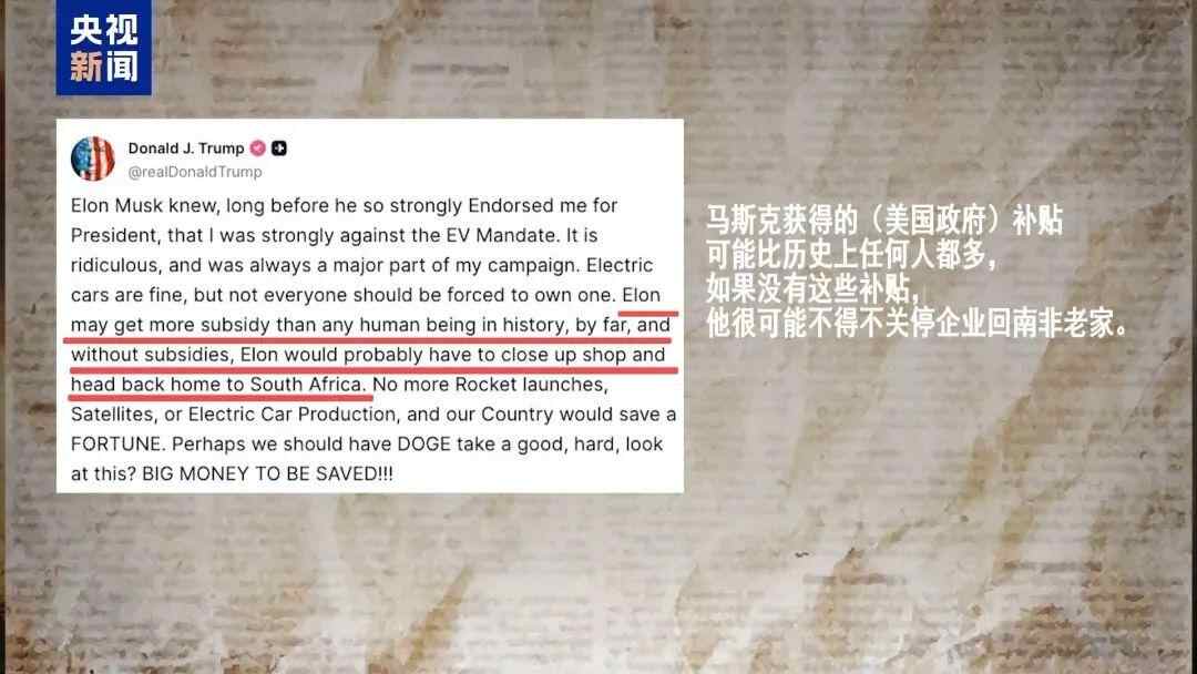 特朗普当天凌晨曾在社交媒体上发文称,马斯克“获得的(美国政府)补贴可能比历史上任何人都多,如果没有这些补贴,他很可能不得不关停企业回南非老家。”特朗普还建议美国政府效率部应该好好调查下马斯克公司获取政府补贴的情况。