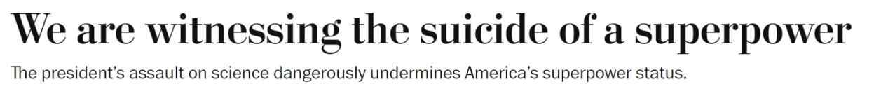 《华盛顿邮报》也刊文警告,美国现政府一直宣称要让美国“再次伟大”,但如今它却正在对美国实力的真正来源——包括对科学研究的长期投资——造成严重的且可能无法弥补的损害。