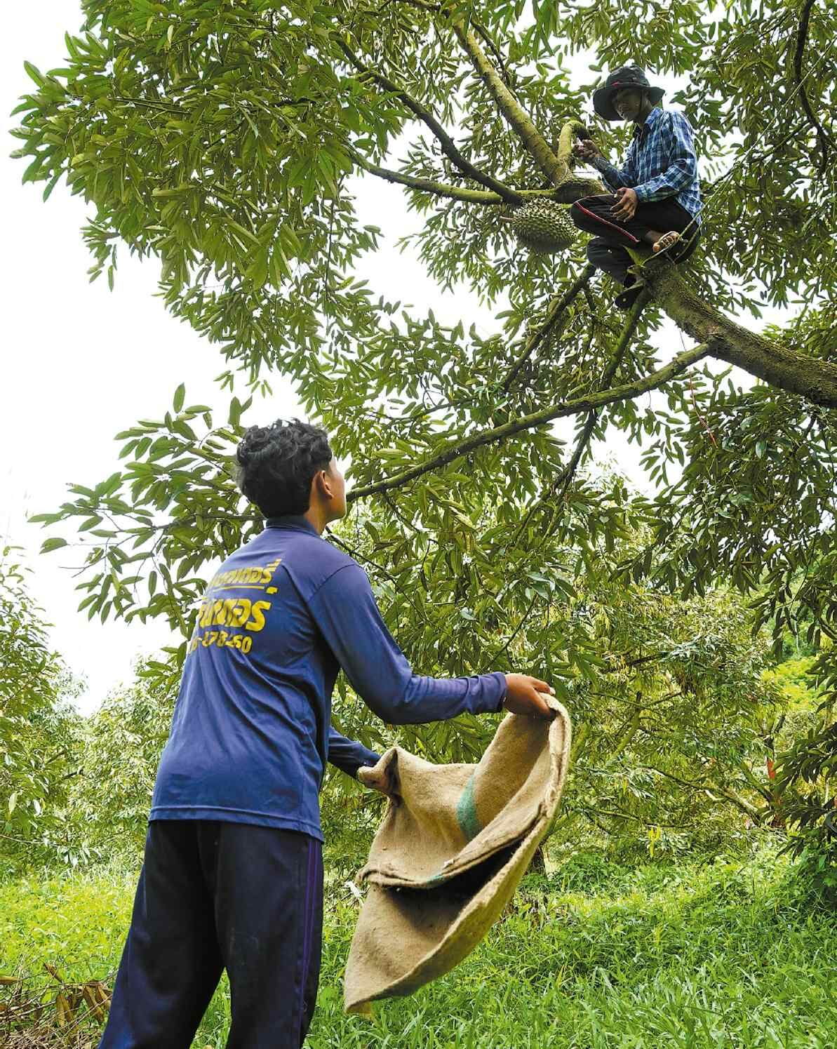庄他武里府的一个种植园里,农民们正在收获榴莲。(图片来源:中国日报 杨万丽 摄)
