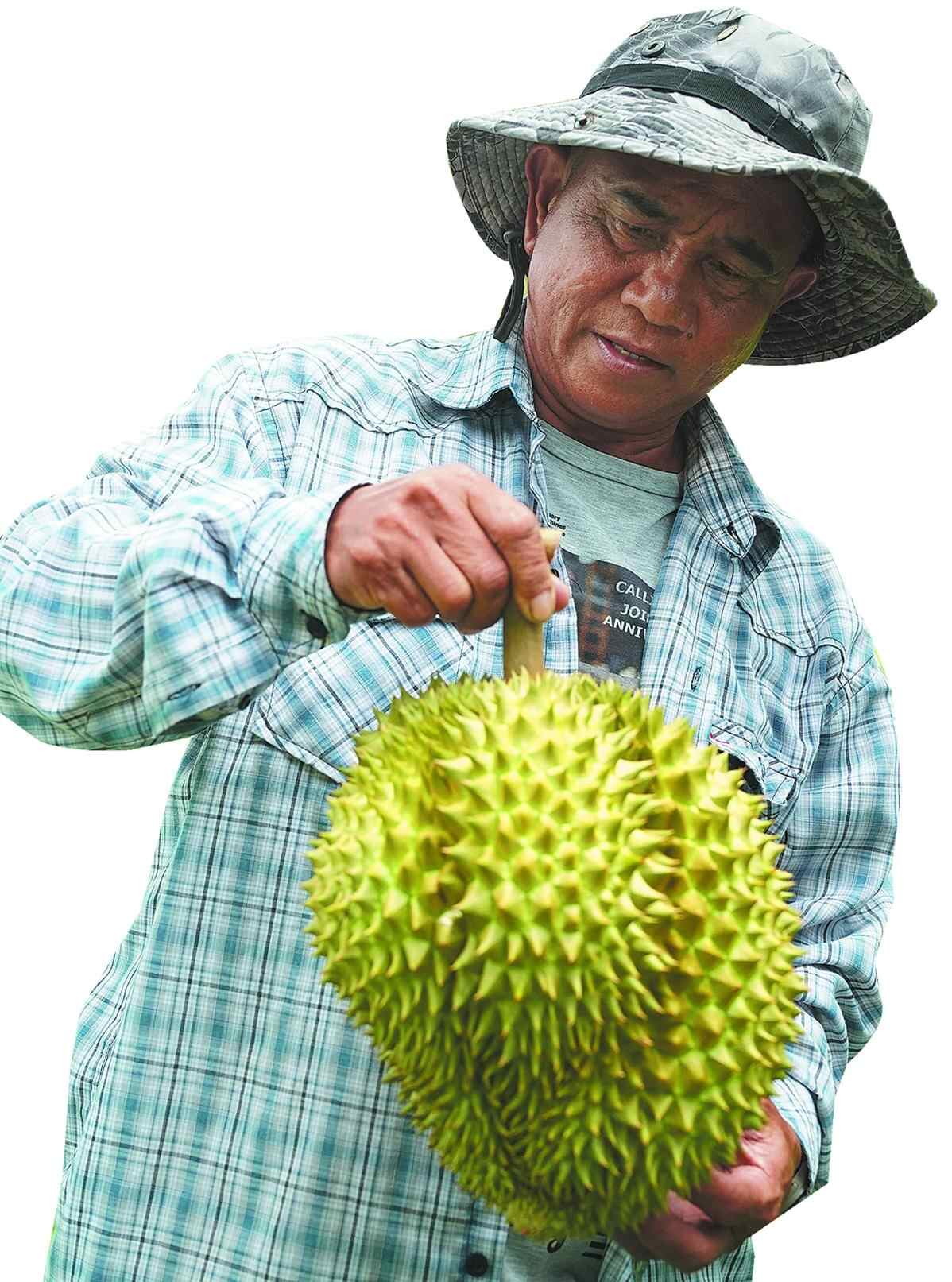 当地农民乔德·占布帕正在展示他种植的榴莲。(图片来源:中国日报 杨万丽 摄)