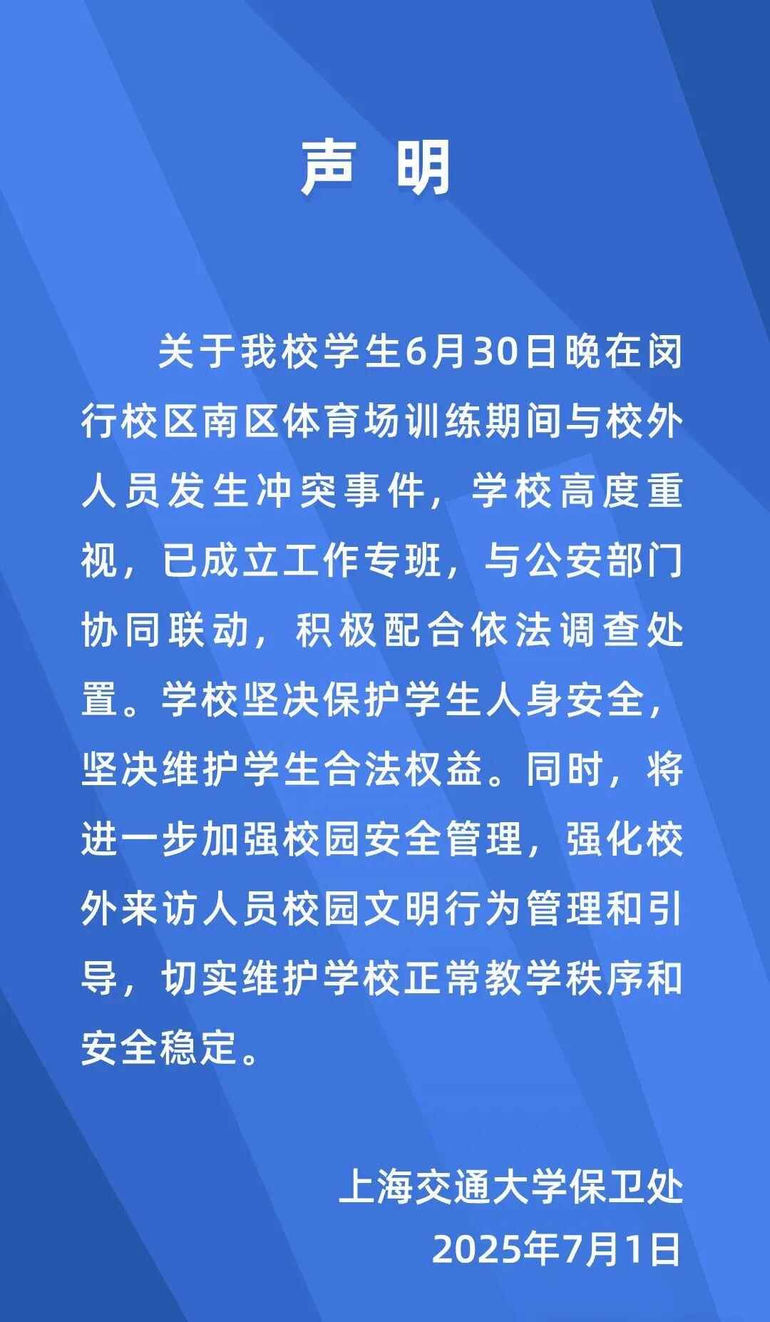 关于我校学生6月30日晚在闵行校区南区体育场训练期间与校外人员发生冲突事件,学校高度重视,已成立工作专班,与公安部门协同联动,积极配合依法调查处置。