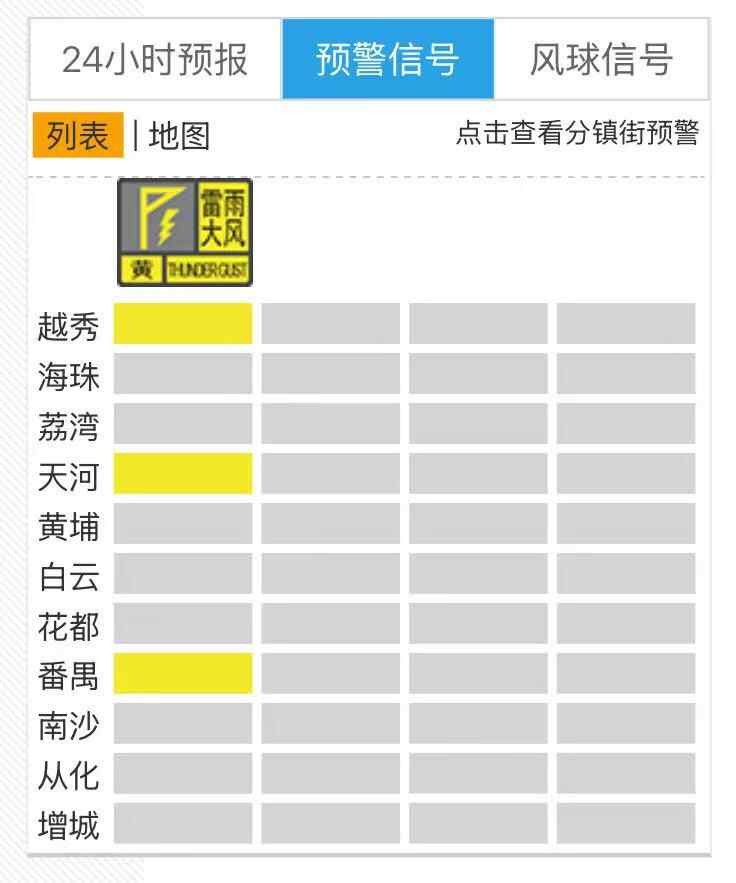 截至2日14时16分,越秀、天河、番禺等区,已经发布雷雨大风黄色预警信号。随着雨势发展,不排除广州各区后续继续发布或调整预警信号,请市民做好防御工作。