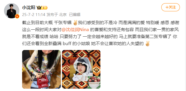 截至目前大概(卖出)千张专辑。我们感受到的不是冷,而是满满的爱,特别暖,感恩。感谢这么一段时间大家对沈佳润的喜爱和支持还有包容,而且我们家一贯的家风就是不看成绩,只要努力了一定会越来越好的。马上就要准备第二张专辑了,你们还会看到全新叠满buff的小姑娘,她不会让喜欢她的人失望的。