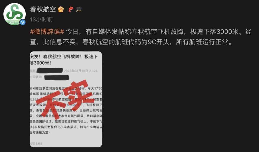 6月30日晚,春秋航空官方发布消息:有自媒体发帖称春秋航空飞机故障,极速下落3000米。经查,此信息不实,春秋航空的航班代码为9C开头,所有航班运行正常。