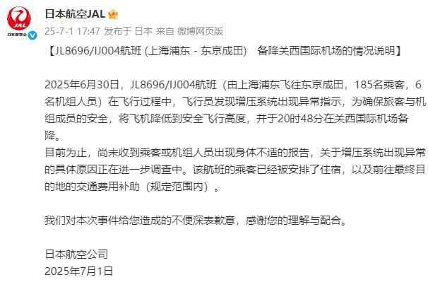 7月1日,日本航空公司也发布了情况说明,全文如下: