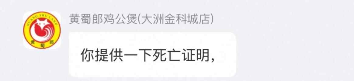 黄蜀郎鸡公煲总部客服告诉记者,事情发生在6月2日。武汉大洲金科城店给女子发“提供死亡证明”一话的员工系兼职员工,已经开除。总部客服表示,顾客曾找到门店称自己身体不适,“如果问题确实出在产品上,我们肯定会承担责任,但顾客表示自己没时间去医院,就是要钱,但是她要的钱超出了门店能够接受的范围。”总部客服同时表示,市场监管局已介入此事,“检查了门店厨房的卫生,对相关情况都了解了。”