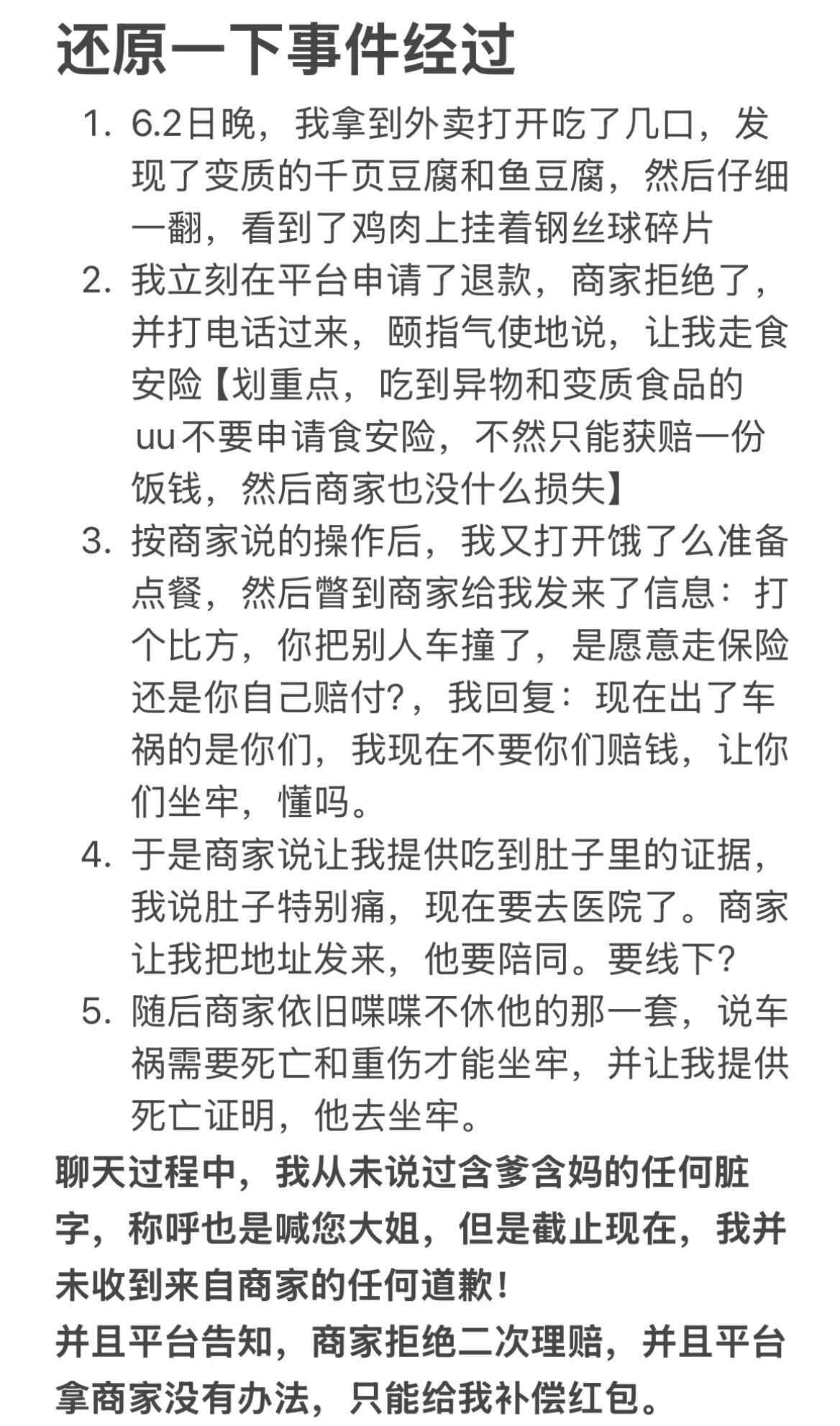 7月1日,有一女子发文吐槽,称自己在6月初于黄蜀郎鸡公煲武汉大洲金科城店下单外卖后,在外卖里发现一根钢丝球丝和变质的千页豆腐。女子表示,自己随后要求退款被商家拒绝,同时商家要求其走食品安全险。女子最后表示,“商家让我提供死亡证明,他去坐牢。”