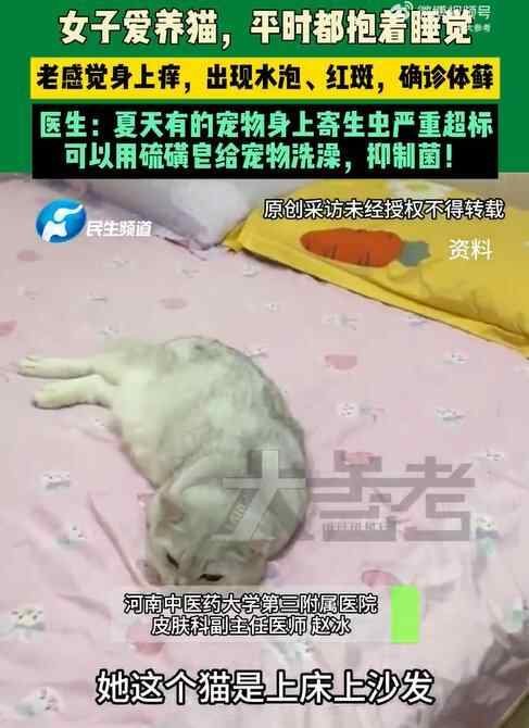 河南郑州一女子因长期抱着猫睡觉,半年后身上频繁发痒,还长出了不少水泡和红斑,就医确诊为体癣。