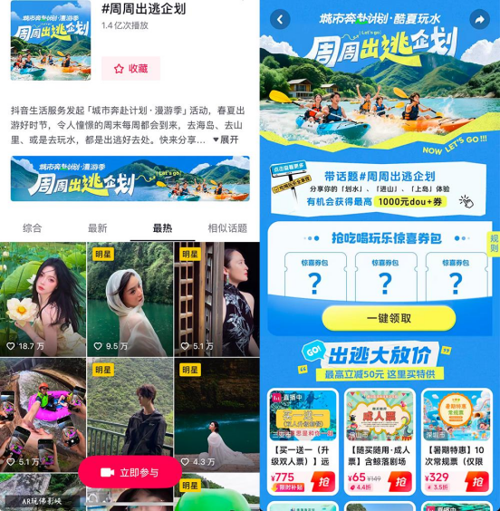 近年,更为便利的周末短途游愈发流行。周末“逃离”城市,在48小时内重启身心,已成为新一代消费者的生活方式之一,抖音#周末去哪玩#话题总播放量超844亿次。抖音生活服务“周周出逃企划”的推出,有利于满足消费者周末出游需求,促进城市及周边文旅产业发展。