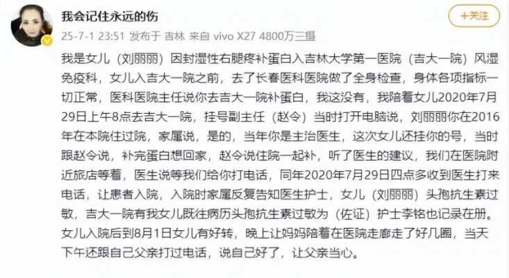 2025年7月1日晚,刘丽丽的家属发文称,自己的女儿(刘丽丽)因风湿性右腿疼补蛋白入吉林大学第一医院风湿免疫科,入院时家属反复告知患者头孢抗生素过敏,主治医生在没有征求家属同意或签字情况下,给其使用了头孢类药物,后出现过敏症状,呼吸困难、头痛、呕吐、冒汗等等。