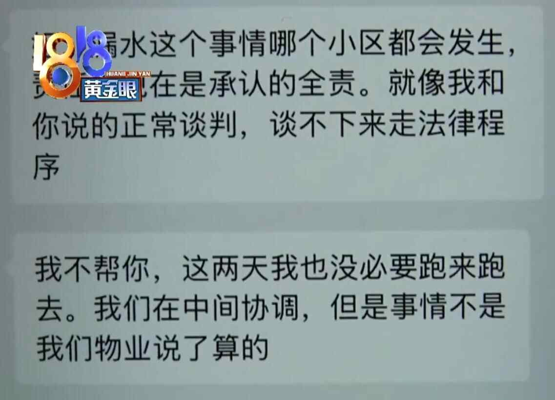 此前小区一位物业经理在微信上和韩女士说,责任人现在承认是全责,韩女士说,此前她和装修公司谈了几次,关于维修方案没有协商一致,记者通过韩女士的微信给装修公司的法务工作人员发去消息,表示想要了解情况,没有收到回复,截稿前韩女士说,还在和对方协商。
