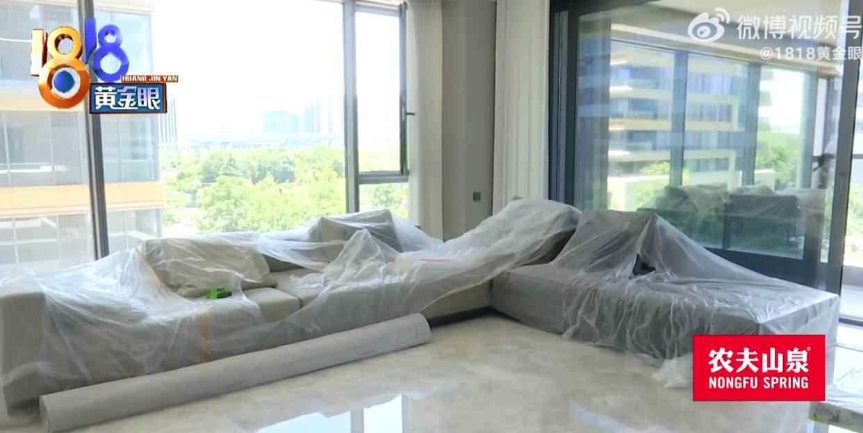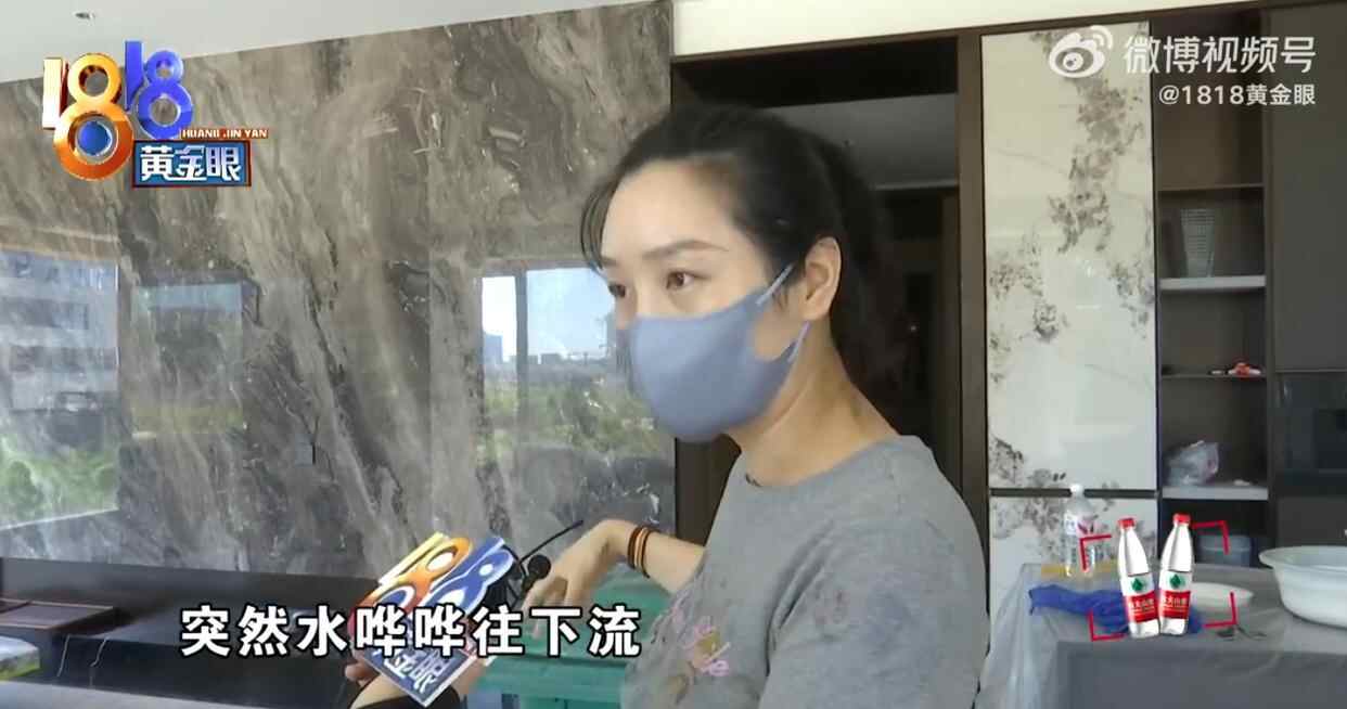 “买的时候就说是精装交付的,1080万,336平方,准备7月1号入住,6月25号我们正在家里修东西,突然水哗哗往下流,物业跟我们说楼上漏水了,到楼上也看了一眼,满地全都是水,到脚踝了,有十几个人都在搞水的问题,就到我们家拿着大盆小盆,都在这接水。楼上是样板间,可能是要重装,工人干活的时候把消防喷淋搞破了,导致水流量特别大。”