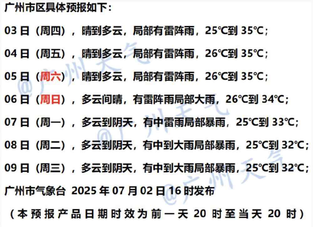 广东省气象台7月2日预计,3日至5日,广东高温炎热,午后有分散(雷)阵雨,中北部市县有35℃~37℃的高温天气。结合广州市气象台7月2日预计,受副热带高压控制影响,3日至5日广州以高温炎热天气为主,大部地区最高气温可达35℃以上,午后局地有雷阵雨。