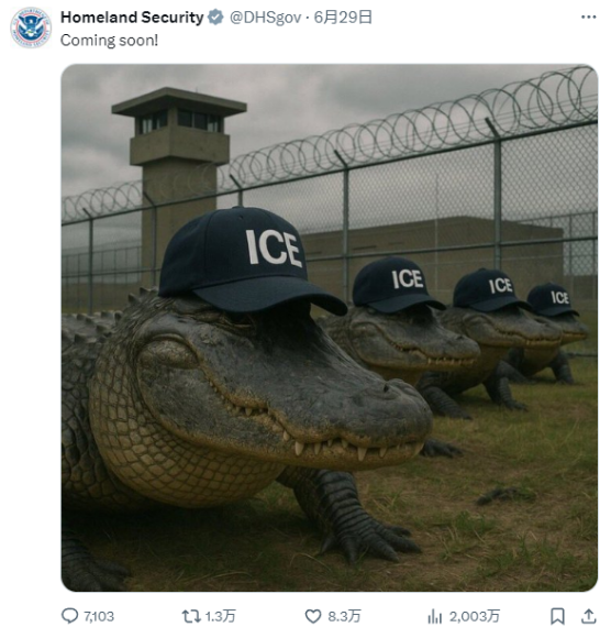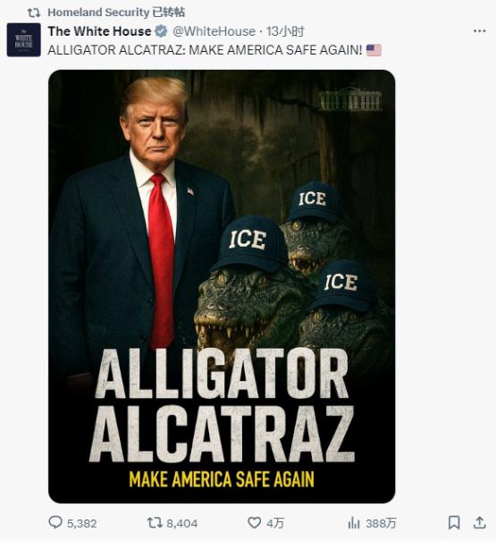 “鳄鱼”似乎成为这座监狱的“卖点”。白宫在其官方社媒发布一张特朗普与头顶美国移民与海关执法局(ICE)制服帽的鳄鱼站在一起的图片,配文“让美国再次安全”。