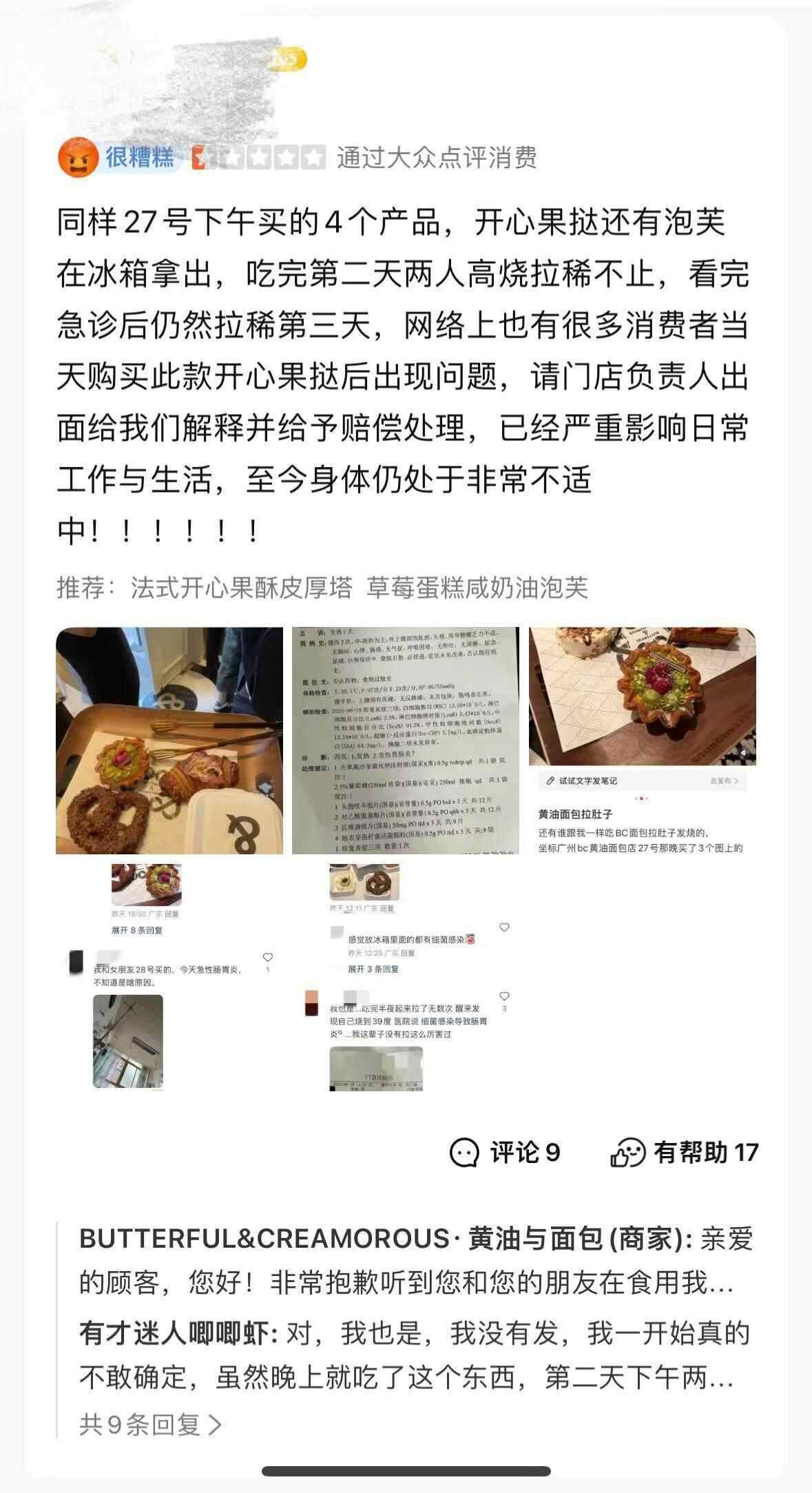 7月2日,多名消费者向羊城晚报记者反映,她们在网红面包品牌BUTTERFUL&CREAMOROUS (中文名为“黄油与面包”)的广州门店天环店购买面包,食用后出现腹泻、发烧等症状,有消费者称确诊细菌感染急性胃肠炎。该门店工作人员表示,已接到反馈,相关产品和原料已送检。