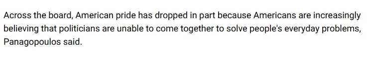这种普遍的不满情绪在今年早些时候也有体现。美国有线电视新闻网(CNN)和SSRS联合进行的一项民意调查显示,不到十分之一的美国两党受访者认为“自豪”一词能形容自己对当今美国政治的感受。在那次调查中,来自美国各政治派别的多数受访者表示对国家政治感到“失望”或“沮丧”。