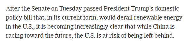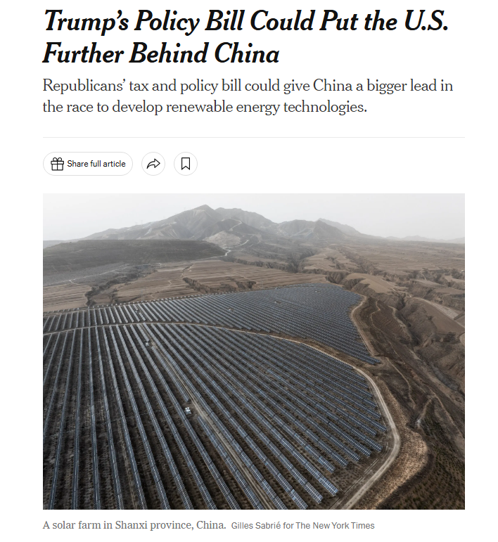 文章指出,“大而美”法案以目前的形式将使美国的可再生能源“脱轨”。而且,越来越明显的是,当中国正在向未来迈进时,美国正面临被抛在后面的风险。