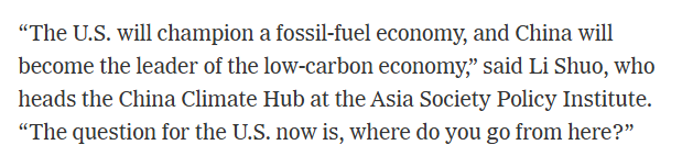 亚洲协会政策研究所中国气候中心一位负责人指出,“美国将倡导化石燃料经济,而中国将成为低碳经济的领导者”。“美国现在的问题是,接下来将何去何从?”
